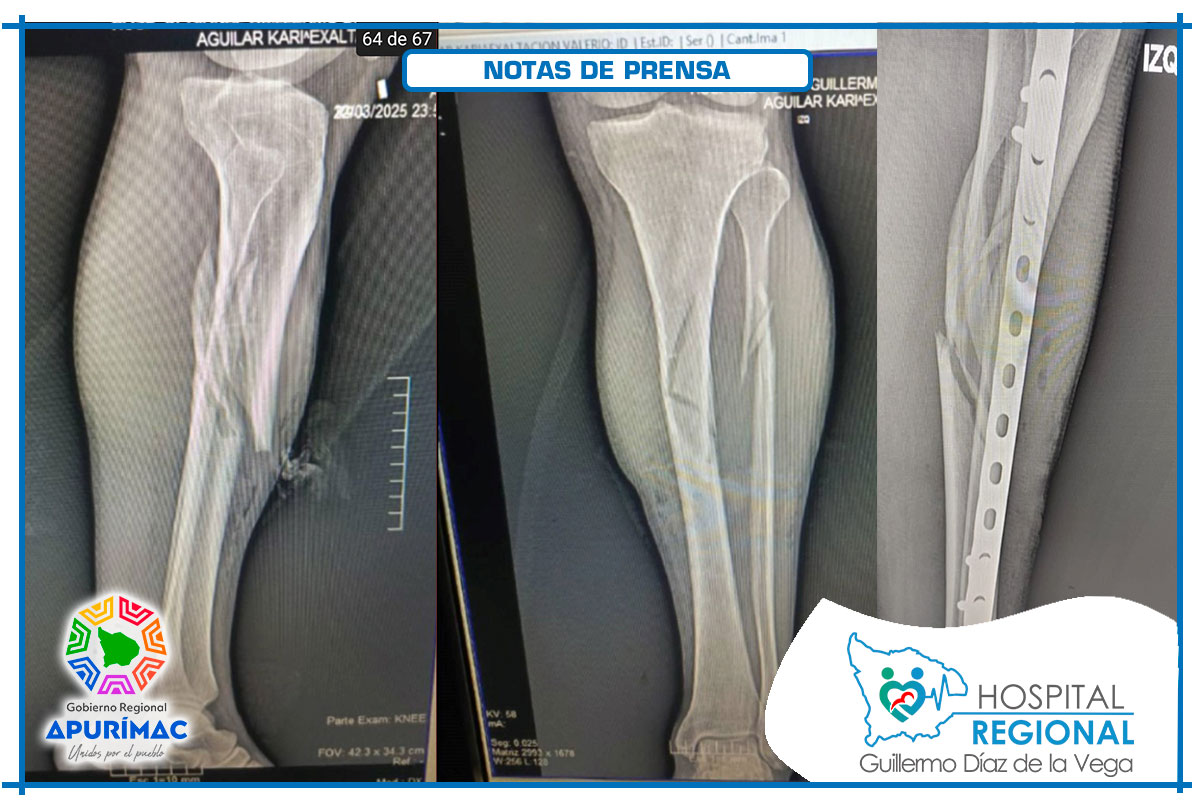 En un importante avance para el servicio de Traumatología del Hospital Regional Guillermo Díaz de la Vega, se realizó con éxito una intervención quirúrgica pionera en la institución el pasado 25 de marzo del presente año. Se trató de una cirugía de osteosíntesis en un paciente que sufrió una fractura multifragmentaria de diáfisis de tibia, luego de que el árbol de la yunsa, al ser derribado, aplastara su miembro inferior. Esta lesión, catalogada como una fractura de alta energía y fractura expuesta de primer grado, también comprometía diversas partes blandas, lo que representaba un desafío quirúrgico de gran complejidad.
