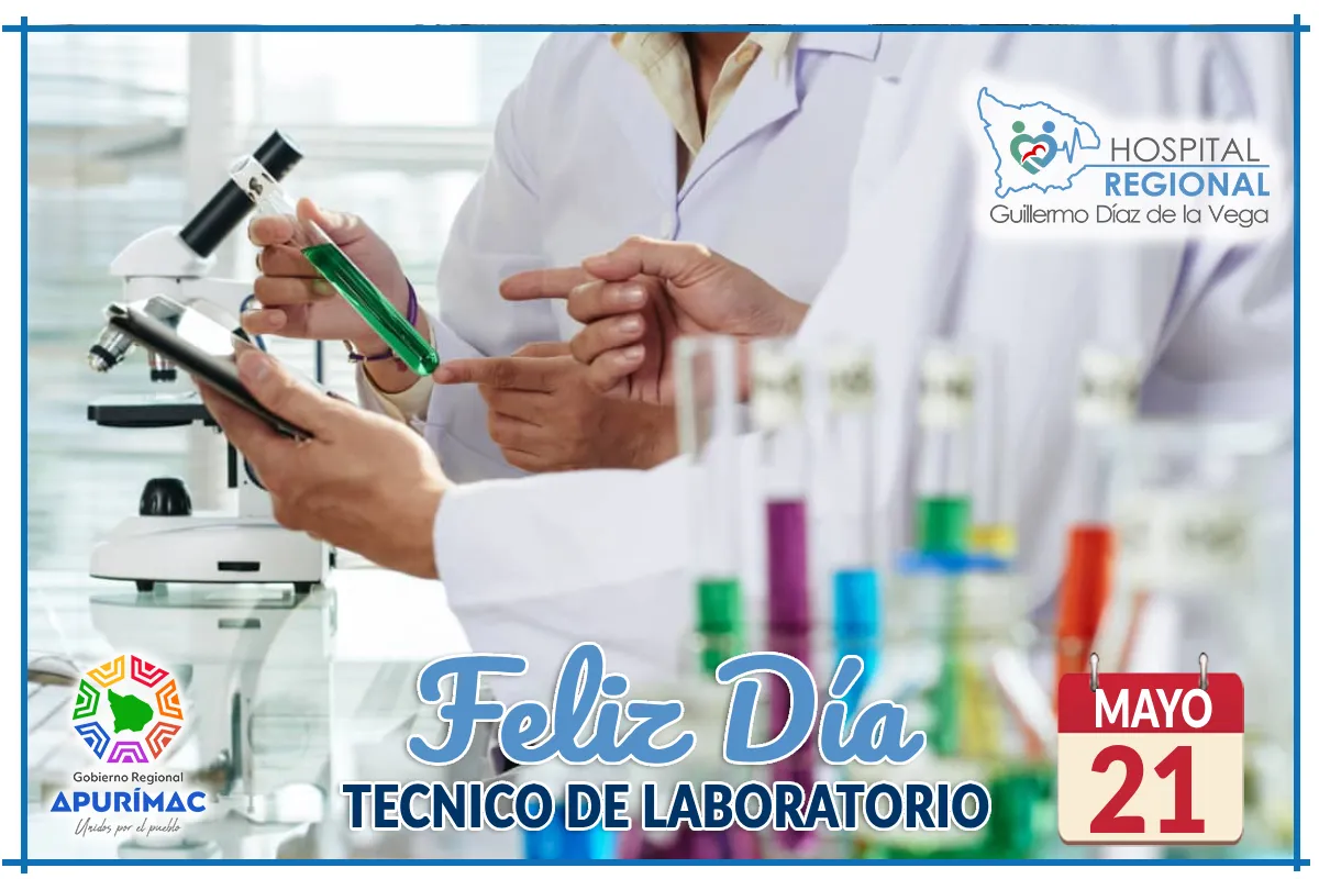 El Hospital Regional Guillermo Díaz de la Vega de Abancay, a través de su Dirección General, expresa su más cálido y sincero saludo a todos los Técnicos en Laboratorio Clínico del Perú, en especial a quienes forman parte de nuestra institución, al conmemorarse el 21 de mayo su día institucional.